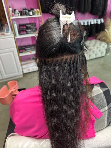 Named after the shape of the extensions,These strand by strand extension also knows as cold fusion are clamped to your hair with a cylinder tube. No heat or bonding agent for this service. required a monthly maintenance to move the extensions up. great of all hair types. Last up to 12 weeks with proper maintenance.