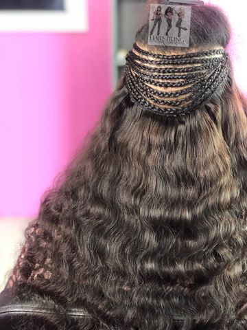 A combination of a sew-in weave and Brazilian knots. half of the head is sewin and the other half is Brazilian knots. the price for this service is based on Brazilian knots prices.